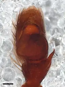 Adult females are 3 to 4 mm in body length, while males are 2.5 to 4.5 mm.[11][13] The sides of the cephalothorax are nearly vertical in front, and more rounded in the back.[2] The ocular area occupies nearly three-fifths of the length of the cephalothorax and is widest at the posterior lateral eyes (PLE).[2] The anterior median eyes (AME) are twice as large as the anterior lateral eyes (ALE), while the PLE are roughly the same size as the ALE.[2]