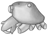 The cephalothorax of Z. sexpunctatus is bronze to black in color.[10][11] Like all Zygoballus spiders, the cephalothorax is box-like in shape, being widest at the posterior lateral eyes.[6][12] Numerous white or pale blue scales cover the clypeus ("face") and chelicerae.[10][13] This covering extends around the sides of the carapace, ending beyond the posterior median eyes.[3] In males, the labium is two-fifths as long as the maxillae, and as wide as it is long.[6] The chelicerae of males are greatly enlarged and obliquely oriented, with each chelicera having a prominent inner tooth and a long, curved fang.[5]